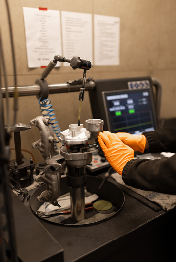 To kluczowy etap. Przy użyciu maszyn marek CIMAT oraz SCHENCK  doważamy rdzeń turbiny przy prędkościach dochodzących do 250 000 obr./min oraz kalibrujemy zmienną geometrię.
